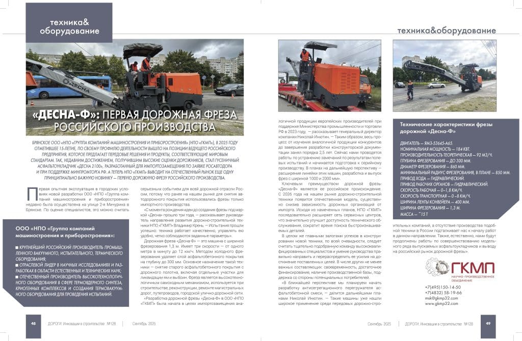 Брянское ООО «НПО «Группа компаний машиностроения и приборостроения» (НПО «ГКМП»), в 2025 году отметившее 15-летие,по своему профилю деятельности вышло на позиции ведущего российского предприятия, которое предлагает передовые решения и продукты, соответствующие мировым стандартам. Так, недавним достижением, получившим высокие оценки дорожников, стал гусеничный асфальтоукладчик «Десна 2100», разработанныйдля импортозамещения по заявке Росавтодора и при поддержке Минпромторга РФ. А теперь НПО «ГКМП» выводит на отечественный рынок еще одну принципиально важную новинку — первую дорожную фрезу российского производства.